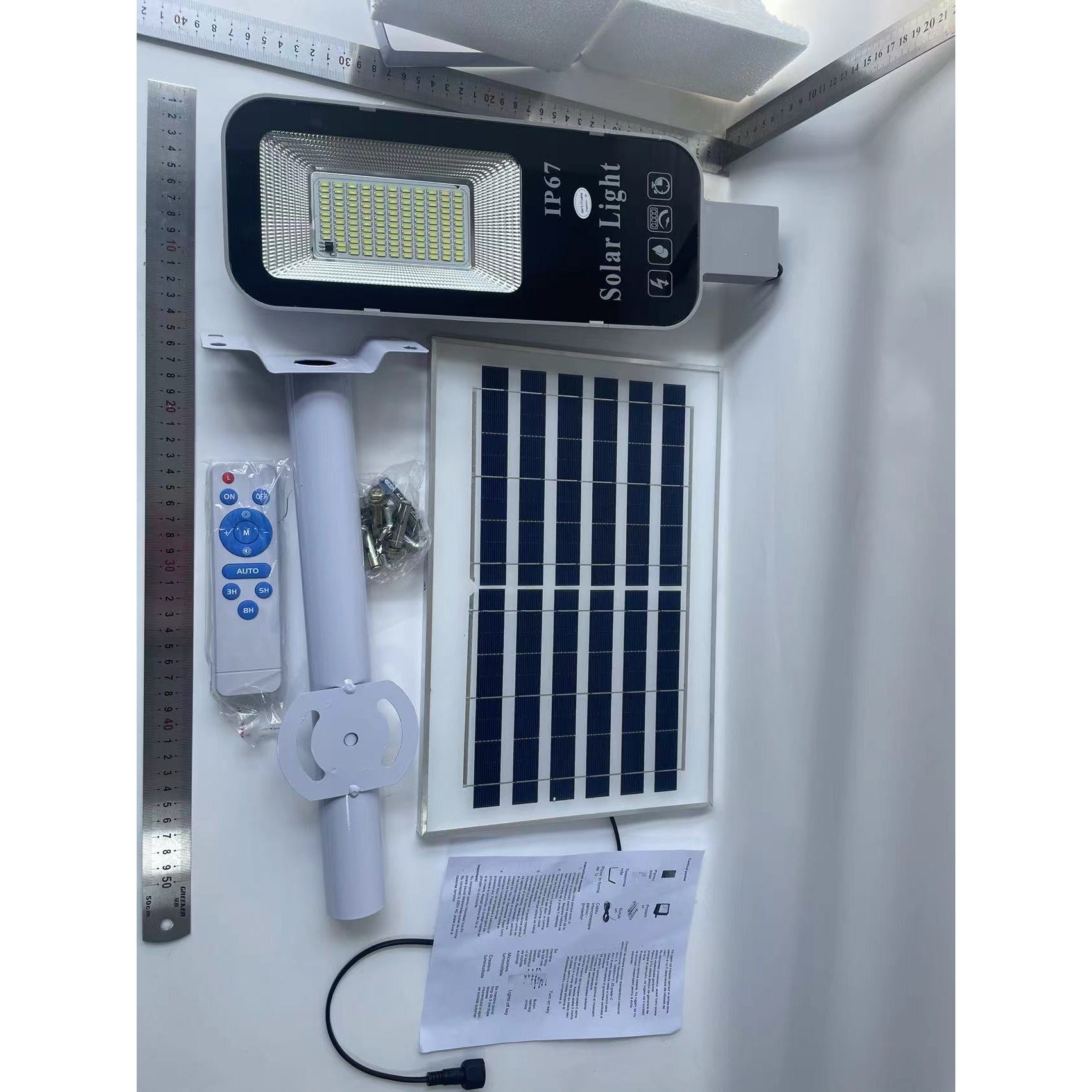 Proiector LED pentru stalp, casa, perete cu suport metalic inclus, Smart, 38,5 cm x 14,2 cm, Rezistent la Apa IP65, cu Panou Solar, 240 COB LED, 100 W, Senzor de lumina, Timer, cu Telecomanda, intensitate reglabila, kit montaj inclus, Lumina Rece